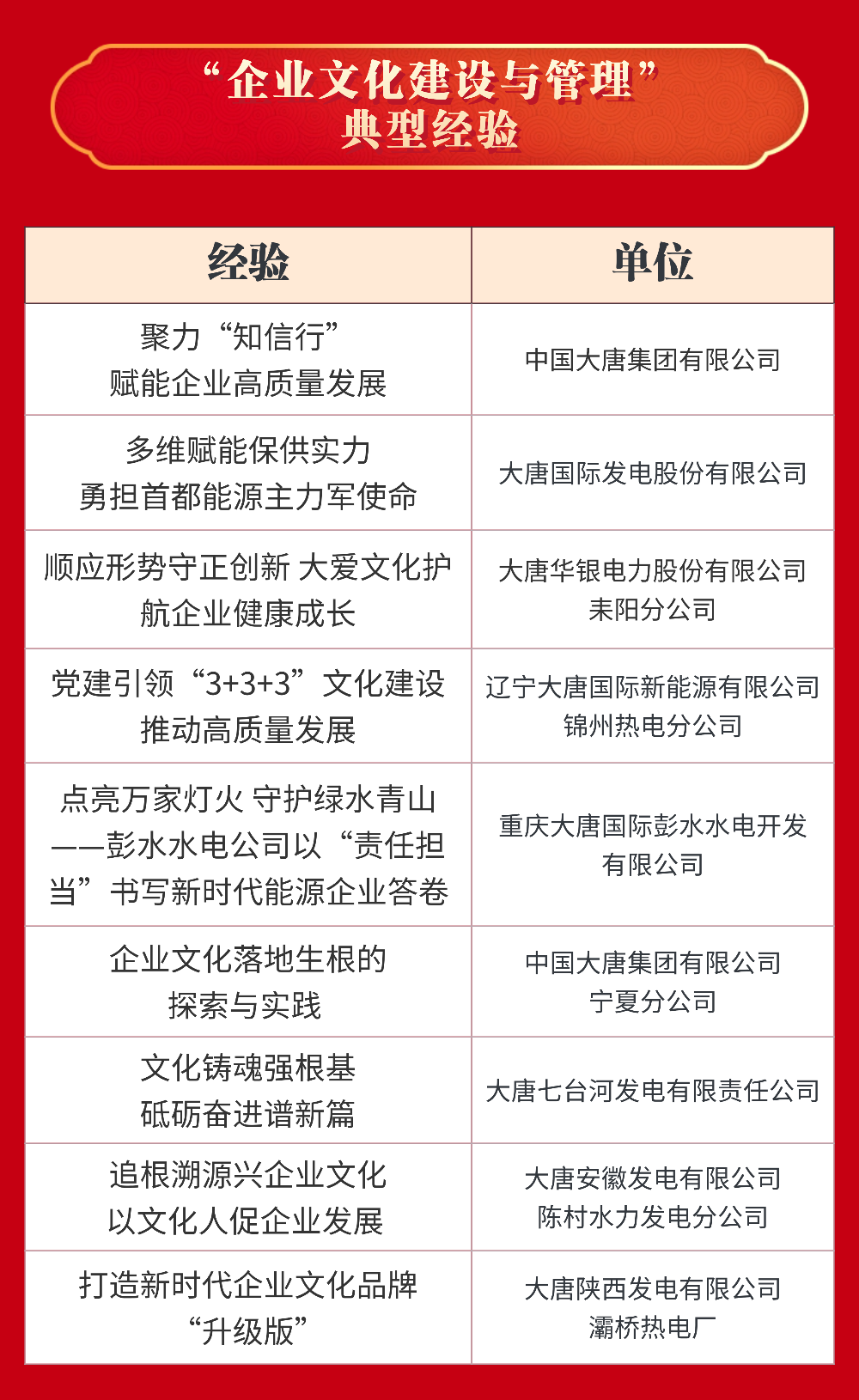 大唐国际发电股份有限公司等22家单位获评“十四五”企业文化建设与管理典型案例;中国大唐及所属8家单位获评“十四五”企业文化建设与管理典型经验;中国大唐及所属5家单位获评课题研究成果一等;大唐国际发电股份有限公司张家口发电分公司等6家单位获评课题研究成果二等。具体名单如下: