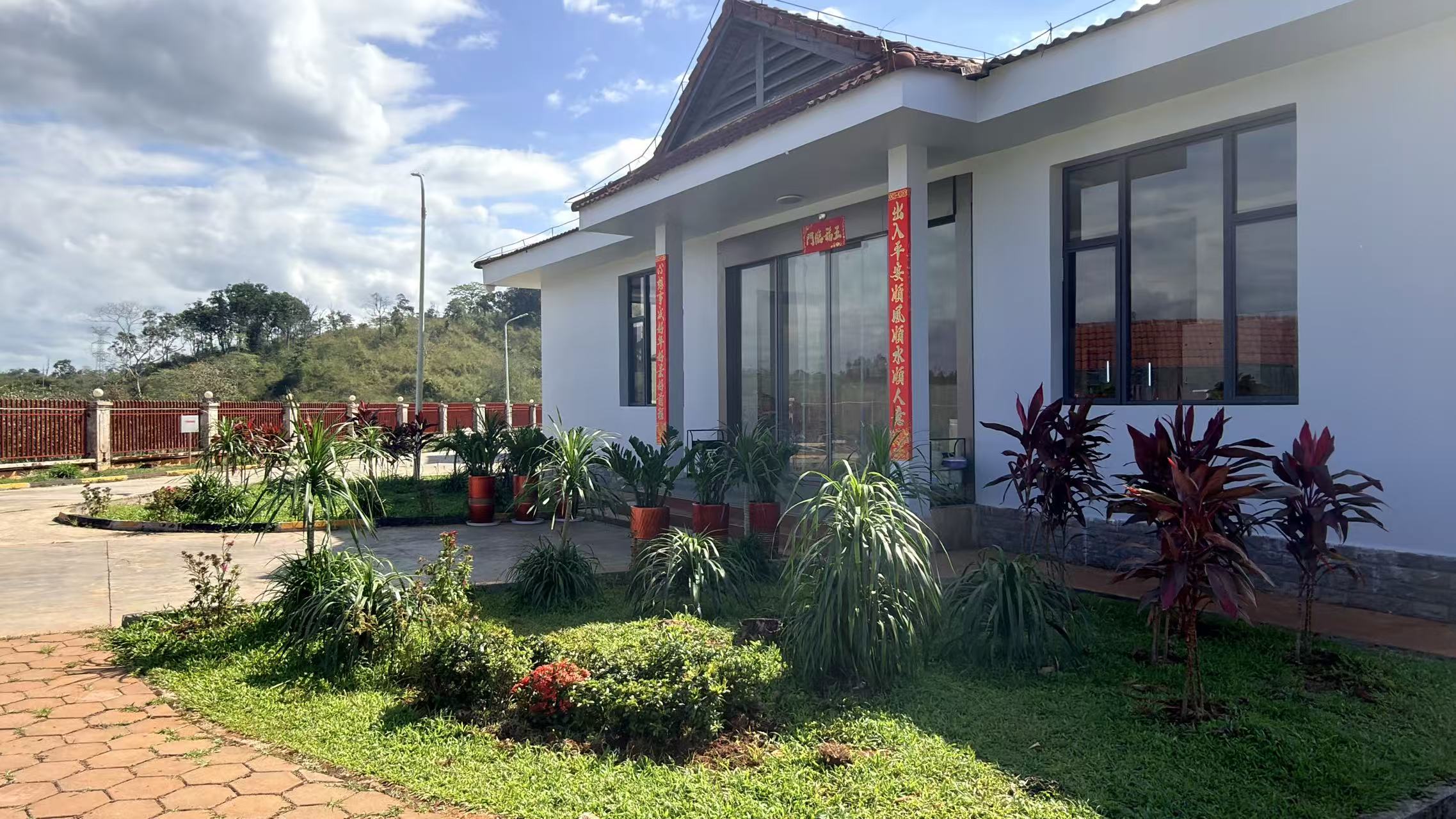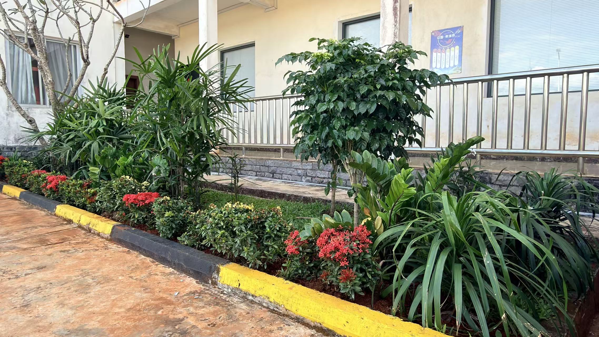 此次营地绿化升级,是公司深入践行“以人为本”理念、推进“幸福大唐”建设的重要举措,也是打造温馨舒适海外家园的暖心行动。结合柬埔寨热带气候特点,公司精心挑选适应性强、观赏性佳的本土绿植与花卉。在办公楼前、道路两侧、边角空地打造层次丰富的景观带:鸡蛋花树舒展枝桠,翠绿叶片间点缀着洁白花苞;朱蕉、散尾葵等热带植物错落生长,与鲜红的花卉相映成趣;规整的花池与黄黑相间的路缘石相得益彰,既美化了环境,也规范了通行秩序。从办公区到生活区,从主干道到边角绿地,每一处都经过精心规划,让员工在忙碌的生产工作之余,能够推窗见绿、移步闻香,在自然绿意中舒缓压力、放松身心。