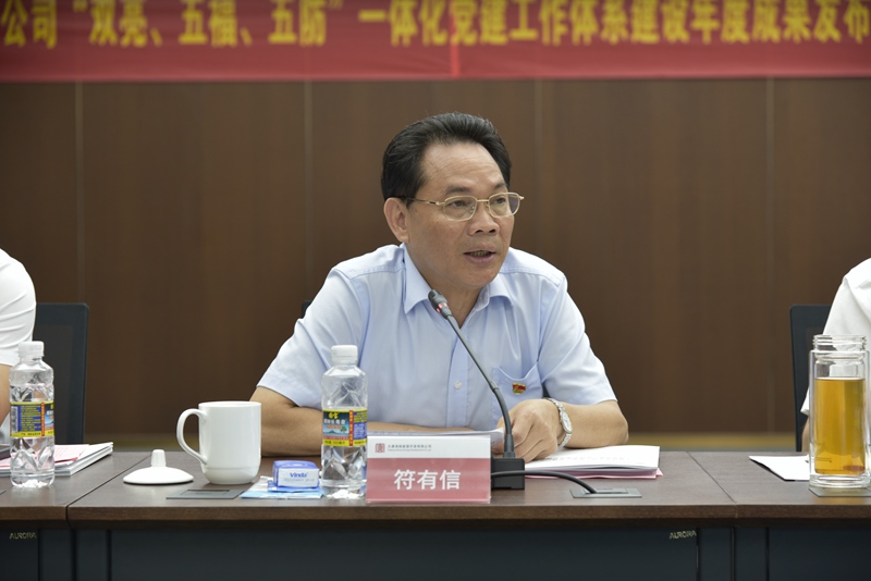符有信在讲话中指出,大唐海南公司在实施“双亮五福五防”一体化党建工作体系方面,着重体现“以人民为中心”的思想,体现物质生活与精神生活的共同富裕,把创业和“五福计划”紧密联系起来,着力解决员工最关心、最直接、最现实的利益问题和最困难、最操心、最忧虑的实际问题,在公司创业发展、职工购房、子女就学、高层次人才认定、职工体验和心理健康辅导、建设职工健身活动室等方面做了大量有成效的工作,使得他们对美好生活的向往更加充实、更有保障、更可持续,取得良好的成效和社会反响,擦亮了“幸福大唐”建设的“金字招牌”。他希望,大唐海南公司继续深入推动“双亮五福五防”一体化党建工作体系建设,充分调动职工参与公司发展的积极性、主动性和创造性,团结广大职工铆足劲头在自贸港建设的新征程中接续奋进、砥砺前行,以一流业绩建功自贸港,推动产业工人队伍建设改革持续深入。