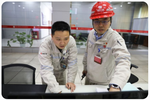 俞荣厚(右)在中控室查看设备运行参数(央广网发 廖唯摄)