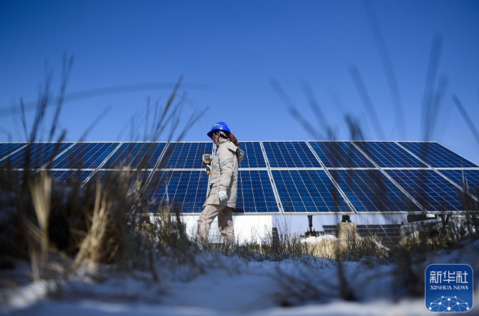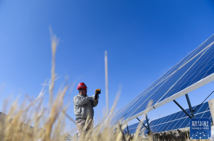 ↑2月8日,大唐青海能源开发有限公司工作人员在青海省海南藏族自治州共和县塔拉滩光伏电站巡检。