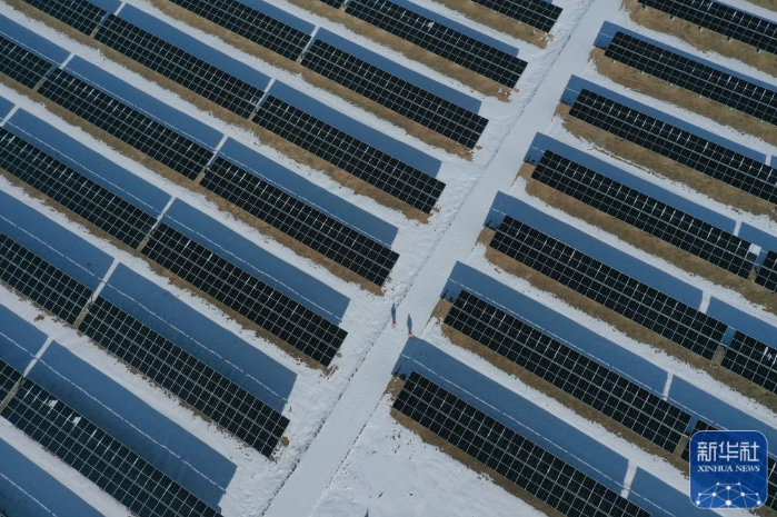 ↑2月8日,大唐青海能源开发有限公司工作人员在青海省海南藏族自治州共和县塔拉滩光伏电站巡检(无人机照片)。